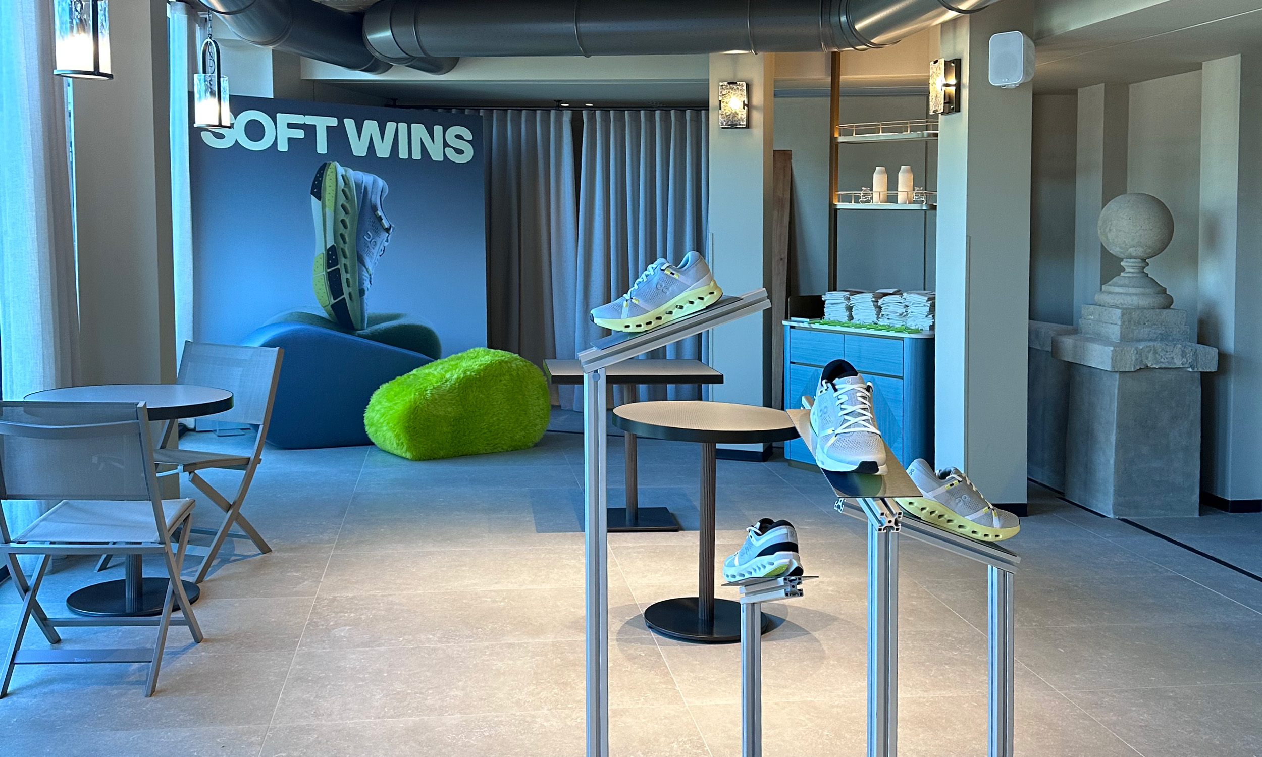 L’obiettivo era creare uno spazio esperienziale in grado di incarnare i valori del brand On: prestazione, cura e leggerezza. Un hub all’interno del quale accogliere atleti, ospiti e visitatori per vivere momenti chiave prima e dopo la gara, sotto il segno della campagna Soft Wins.