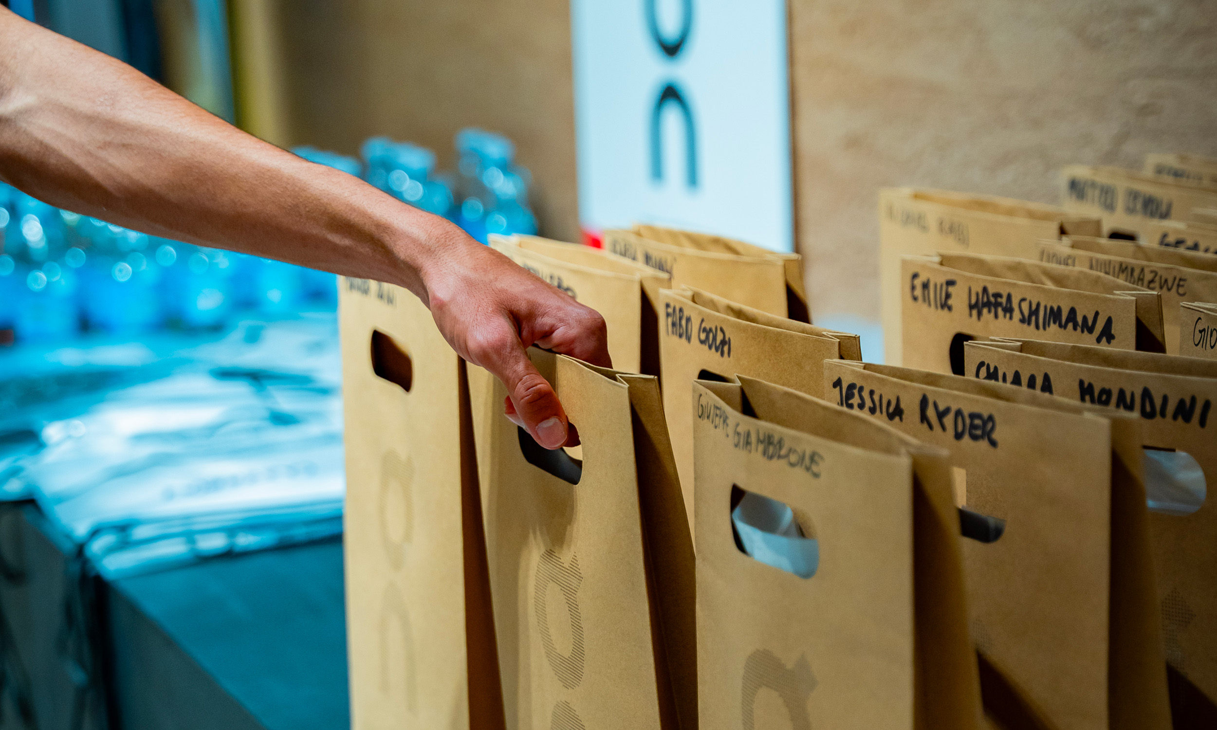 Un’area strategica progettata per facilitare il ritiro materiali e generare il primo contatto fisico tra brand e partecipanti.